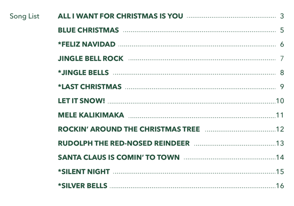 *** SONG LIST: All I Want for Christmas Is You, Blue Christmas, Feliz Navidad, Jingle Bell Rock, Jingle Bells, Last Christmas, Let It Snow, Mele Kalikimaka, Rockin' Around the Christmas Tree, Rudolph the Red-Nosed Reindeer, Santa Claus Is Comin' To Town, Silent Night, Silver Bells ***